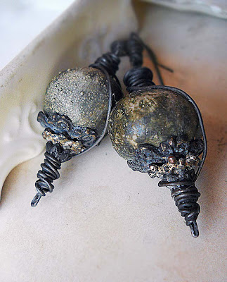 I love the way the glaze turned out on these air dry clay beads above. Believe it or not, I used crazy dollops of plain black and white acrylic mixed with the Kato liquid--and it turned out GREEN! Could not believe it. There are two more that also turned out green, and all the green ones happened to be in fair pairs. Everything else turned out an expected grey. The texture on these is due to the paint getting all blistered in the heat, then setting hard with the Kato. Gives it kind of a sugar bead effect or maybe a slip effect. I can't remember pottery terms.